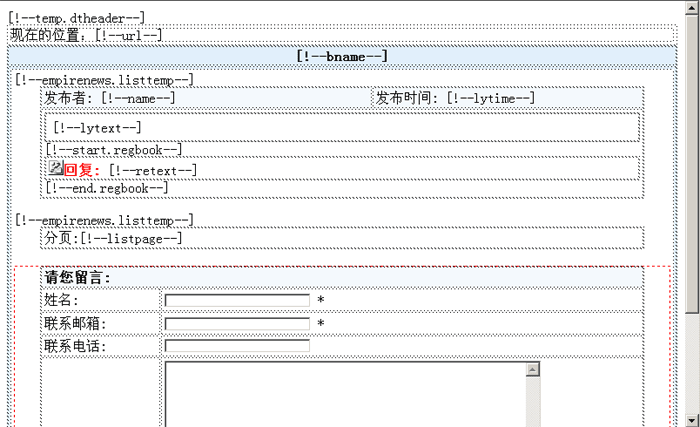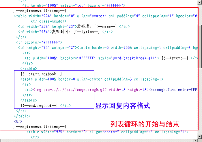 说明:第一个[!--empirenews.listtemp--]表示循环开始、第二个[!--empirenews.listtemp--]表示循环结束。