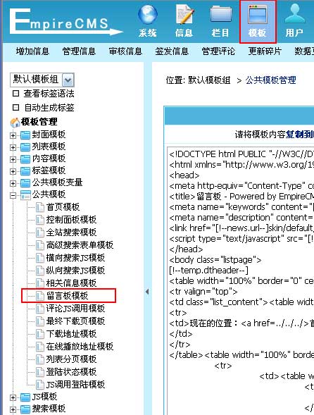 1、登录后台,单击“模板”菜单,选择“留言板模板”子菜单,进入修改留言板模板界面: