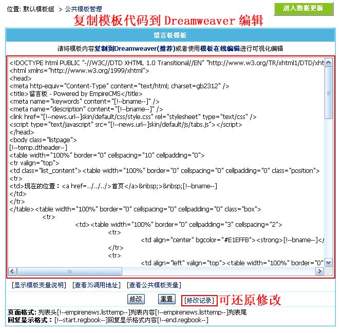 2、进入“修改留言板模板”界面,将模板代码复制到Dreamweaver编辑,如下图: