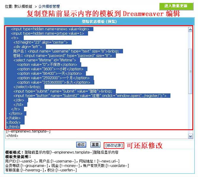 2、进入修改登陆状态模板界面,将“登陆前显示内容”与“登陆后显示内容”的模板代码分别复制到dreamweaver编辑,如下图: