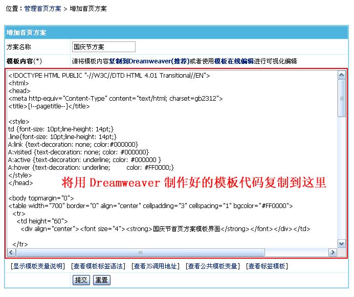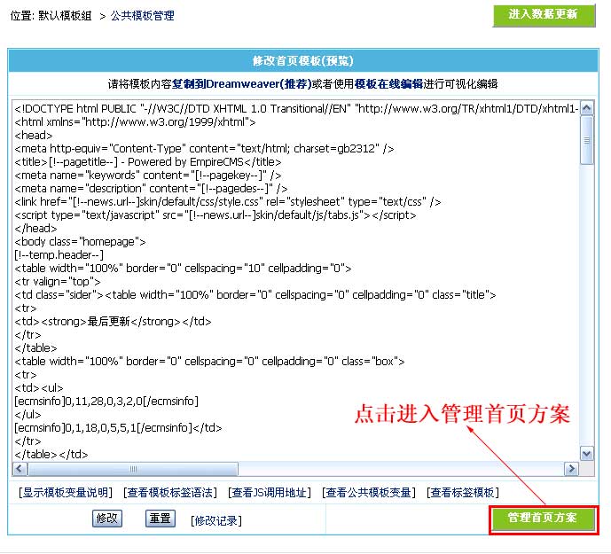 1、登录后台,单击“模板”菜单,选择“首页模板”子菜单,进入修改首页模板界面: