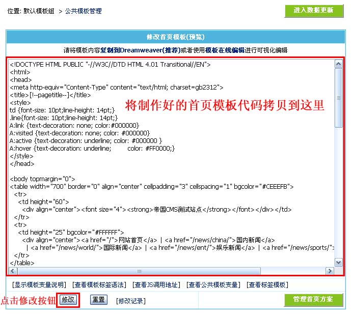 拷贝首页模板代码,单击“修改”按钮提交,首页模板制作完毕: