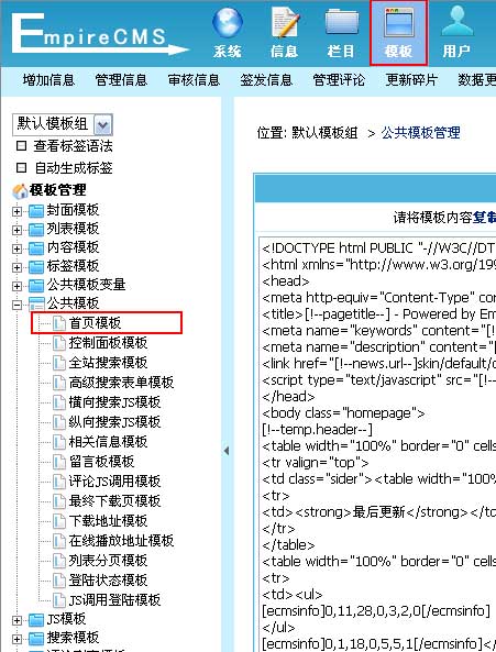 1、登录后台,单击“模板”菜单,选择“首页模板”子菜单,进入修改首页模板界面: