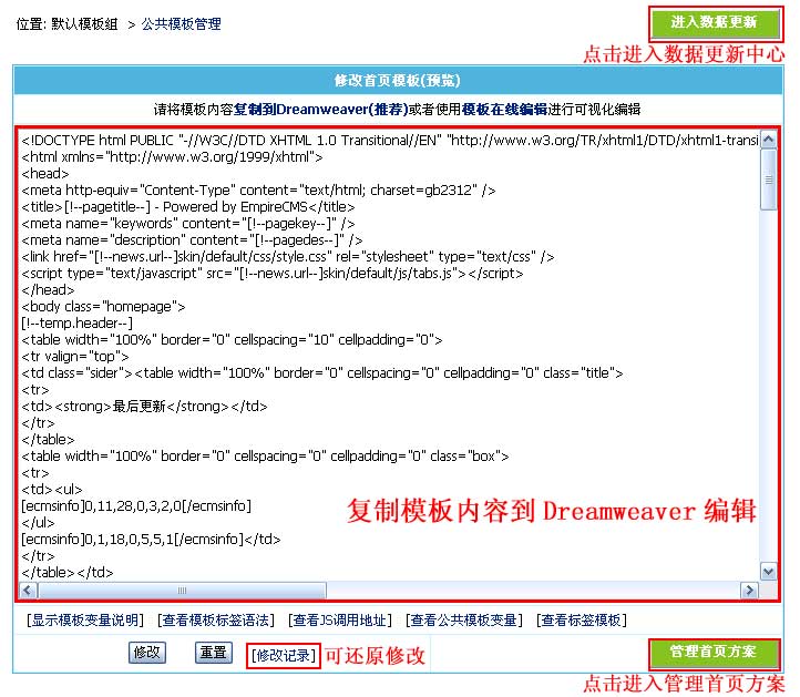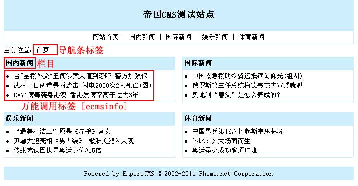 说明:首页模板支持所有模板标签,只是上面例子我们只使用了ecmsinfo标签。