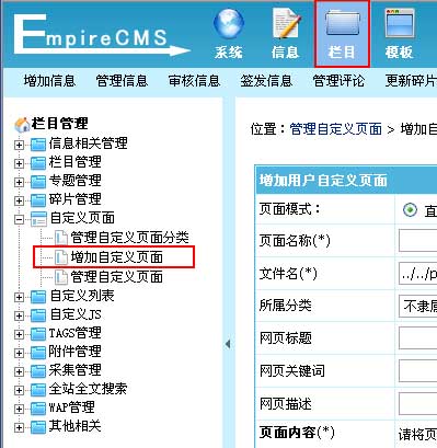 1、登录后台,单击“栏目”菜单,选择“增加自定义页面”子菜单,进入增加自定义页面界面: