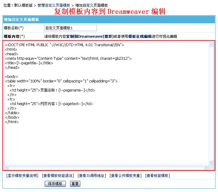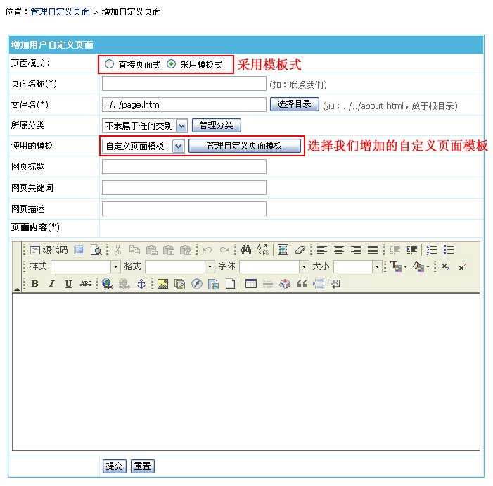 1、登录后台,单击“模板”菜单,选择“增加自定义页面模板”子菜单,进入增加自定义页面模板界面: